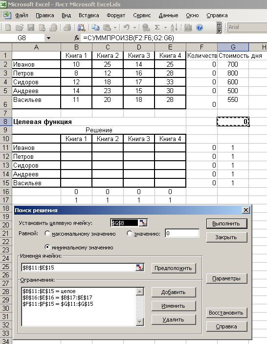 При решении задач о назначении особый интерес вызывает способ ввода ограничений при заполнении формы модуля Поиск решения и формулы целевой функции: