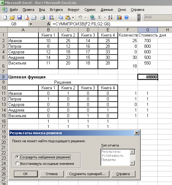Запуск процесса оптимизации производится нажатием кнопки Выполнить. По окончании счета появляется диалоговое окно Результаты поиска решения. Нажав в нем соответствующую кнопку, можно сохранить найденное решение или восстановить исходные значения. Изменения при этом коснутся как целевой ячейки, так и влияющих ячеек. В этом же диалоговом окне можно указать необходимые типы отчетов, которые будут размещены на отдельных листах книги. Отчет Результаты отражает исходные и результирующие значения целевой и влияющих ячеек, а также сведения о наложенных ограничениях.