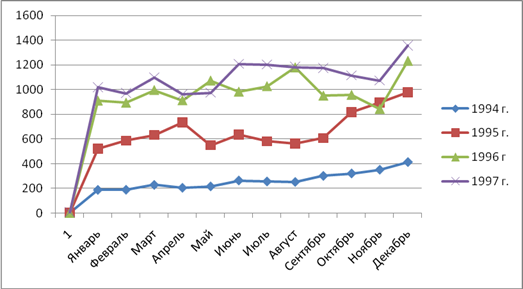 Рисунок 1. Зависимость объемов розничного товарооборота от времени На основе полученной диаграммы видим, что в 1994 году с января по декабрь объем товарооборота нарастал постепенными темпами. В декабре он достиг значения 414 млрд. руб. (в январе 1994 года объем товарооборота 1 89 млрд. руб.). В 1994 году незначительные спады объема товарооборота наблюдаются лишь в апреле, июле и августе. В 1995 году происходит значительное увеличение товарооборота по сравнению с аналогичными периодами 1994 года. С января по апрель наблюдается постепенный рост объема товарооборота с 522 млрд. руб. до 732 млрд. руб. В мае величина товарооборота резко уходит вниз до 549 млрд. руб. и уже с мая по сентябрь 1995 года объем товарооборота колеблется около этого значения, то увеличиваясь, то уменьшаясь. И только в октябре происходит резкий подъем товарооборота до 815 млрд. руб. Стабильный рост объема товарооборота наблюдается до конца 1995 года. Изменения объема товарооборота в 1996 году имеет характер спадов и подъемов, причем в августе и ноябре наблюдаются резкие скачки. В ноябре 1996 года значение изучаемой величины достигло уровня ниже значения аналогичного периода предыдущего года. Для декабря 1996 года характерен резкий подъем объема розничного товарооборота. Особенностью динамики розничного товарооборота в 1997 году является спад в феврале и апреле, а затем подъем в июне. В период с июня по ноябрь объем розничного товарооборота постепенно уменьшался с 1209 млрд. руб. до 1075 млрд. руб. В декабре изучаемая величина достигла своего максимального значения 1359 млрд. руб. за весь исследуемый период. Таки образом объем товарооборота в период с января 1994 года по декабрь 1997 года, претерпевая различные изменения, увеличился со 189 млрд. руб. до 1359 млрд. руб. 1.2 Анализ зависимостей с помощью коэффициентов корреляцииРассчитать коэффициенты корреляции, используя «Мастер функций - коррел.» (коэффициенты корреляции показывают тесноту связи между двумя показателями y и x и могут принимать значения в диапазоне от 0 до 1) и коэффициенты детерминации (квадрат коэффициента корреляции), которые показывают, сколько процентов изменений зависимой переменной объясняется изменениями независимой переменной. - между объемами промышленного производства в 1997 г. (6-й столбец табл. 1) и временем; - между объемами промышленного производства в 1996 г. (5-й столбец табл. 1) и объемами промышленного производства в 1997 г. (6-й столбец табл. 1); - между объемами промышленного производства в 1996 г. (5-й столбец табл. 1) и объемами товарооборота в 1996 г. (4-й столбец табл. 2). Проанализировать полученные результаты, оценив тесноту связи в различные годы, изменения коэффициентов корреляции. Решение: Коэффициент корреляции и коэффициент детерминации между объемами промышленного производства в 1997 г. (6-й столбец табл. 1) и временем равны: Коэффициент корреляции = 0,5 Коэффициент детерминации 0,52 =0,25 Вывод: связь между объемами промышленного производства в 1996 г. и временем умеренная , изменения объема промышленного производства на 25% объясняются изменением времени. Коэффициент корреляции и коэффициент детерминации между объемами промышленного производства в 1996 г. (5-й столбец табл. 1) и объемами промышленного производства в 1997 г. (6-й столбец табл. 1): Коэффициент корреляции = 0,74 Коэффициент детерминации 0,742 =0,55 Вывод: связь между объемами промышленно