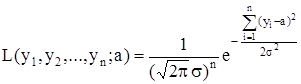 Нетрудно показать, что функция правдоподобия L = L(y1 , y2 , ..., yn ; а) при этом а достигает своего максимума. Таким образом мы показали, что оценка математического ожидания неизвестного сигнала Х по методу наибольшего правдоподобия в предположении нормального распределения аддитивной помехи является средним арифметическим измерений y1 , y2 , ..., yn :