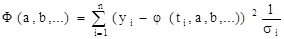 количество уравнений которой равно количеству параметров а, b, ... . В качестве примера рассмотрим упомянутую линейную зависимость при равноценных измерениях: у = аt + b (j (ti ;a, b) = at + b). В этом случае нам нужно минимизировать функцию