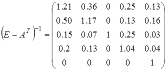 Для нахождения эффекта распространения привлечем уравнение для цен P = AT P + v, откуда P = (E – AT )-1 v. Обратная матрица Леонтьева (E – AT )-1 – ценовой матричный мультипликатор – матричный мультипликатор ценового эффекта распространения. Этот мультипликатор эффекта распространения найдем с помощью пакета Excel, сначала транспонируя матрицу А, затем отнимая ее от единичной матрицы и находя обратную матрицу. Проводя эти вычисления, получим