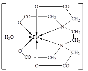 Комплекс железа с ЭДТА ([Fe(ЭДТА)(H2 O)]- ) относится к числу низкоспиновых[14]. В нем лиганд ЭДТА4- , как обычно, гексадентантен. Однако, КЧ иона Fe3+ равно 7, поскольку, кроме четырех атомов кислорода и двух атомов азота, ЭДТА4- во внутреннюю сферу КС входит атом кислорода внутрисферной гидратной воды: