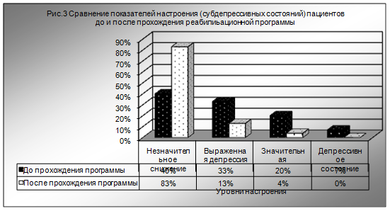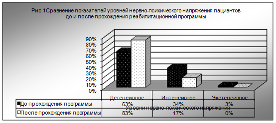 Данная работа осуществляется в комплексе с применением геронтопротекторной терапии, рекомендуемой врачом-гериатром. В результатеее реализации у пожилых пациентов значительно возрастают показатели гибкости и беглости мышления, повышается уровень жизненной активности, качества их жизни. 4.2 Динамика состояния здоровья обследуемых пациентов Для оценки эффективности реабилитационных мероприятий сформирована группа из 111 человек в возрасте 60-74 года (по ВОЗ), из них 63% женщин и 40% мужчин, которые периодически проходили курс реабилитационно-оздоровительных мероприятий с частотой 1 раз в год на протяжение 4 –х лет. Таким образом, в период с января 2000 года по январь 2004 года включительно эти пациенты прошли четырехкратный курс оздоровления в геронтологическом центре и реабилитации по месту жительства. Вследствие чего был проведен 4-х этапный анализ динамики состояния здоровья обследуемых пациентов. Каждый этап соответствует очередному заезду после реабилитации по месту жительства и с последующим направлением в геронтологический центр. В процессе наблюдения проводилась поэтапная комплексная оценка состояния здоровья пациентов – медико-социальный мониторинг. Подробные итоги исследования были опубликованы в методическом пособии «Характеристика и анализ комплекса реабилитационных мероприятий, проводимых на базе краевого геронтологического центра» от 2003 г. После проведения трехэтапного курса реабилитации у 71% пациентов наблюдалось увеличение периода ремиссии при хронических заболеваниях. У 29% пациентов характер течения заболевания не изменился. Анализ субъективной оценки характера течения заболеваний показал, что данный параметр также существенно изменился. На втором этапе улучшение отметили 70% опрошенных и на третьем – 76,6%. Незначительное улучшение отметили 20% на втором и 16,6% на третьем этапе (р<0,05). На 4 этапе исследования пациентов было выявлено, что в экспериментальной группе сохраняется соотношение в структуре заболеваемости. 59% пациентов страдали гипертонической болезнью. Сопутствующее клиническое заболевание – ИБС стенокардия II функциональный класс зарегистрировано у 54,8%, гипертоническая болезнь с наличием фактора риска (ожирения, поражением органов мишеней) – у 45,2% пациентов. Однако, на 4 этапе исследования было установлено, чтона фоне поддерживающей гипотензивной терапии и проведенных реабилитационных мероприятий артериальное давление стабилизировалось только у 68% пациентов (на 3 этапе – 74%), у 20% артериальное давление оставалось лабильным, у 12,8% пациентов какая-либо динамика отсутствовала. Из числа всех пациентов 51,4% страдали ишемической болезнью сердца стенокардией напряжения II функциональный класс. После проведенного курса реабилитационных мероприятий у 71% из них отмечено улучшение (уменьшение стенокардитических болей, увеличение толерантности к физической нагрузке, уменьшение количества и дозировки принимаемых антиангинальных препаратов). На 3 этапе – у 76%. У 29% пациентов характер течения заболевания не изменился. Заболевания опорно-двигательного аппарата зарегистрированы у 93,3% пациентов, в основном это остеохондроз позвоночника. При этом у 51,5 % обследованных отмечено сочетание остеохондроза с артрозоартритом крупных и мелких суставов. После полного курса реабилитации у 60% (на 3 этапе –86%) 