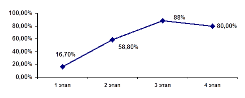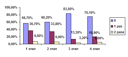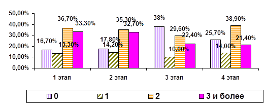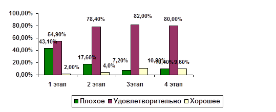 Рис.1. Динамика количества курсов амбулаторного лечения. Снижение числа курсов амбулаторного и частоты стационарного лечения на первых трех этапах исследования пациентов в первую очередь свидетельствует об уменьшении количества обострений хронических заболеваний в течение периода наблюдения. Так если на 1 этапе количество обострений основного и сопутствующего заболеваний более 4 раз наблюдалось у 23,3%, то на 3 этапе этот показатель снизился до 6,7% (р<0,05), 16,7% обследуемых отмечало отсутствие обострений в течение года. Этот показатель можно расценивать как значимый индикатор эффективности реабилитационно-оздоровительных и профилактических мероприятий, проводимых в Краевом геронтологическом центре «Уют», так и на местах. И отмеченное увеличение количества обострений на четвертом этапе (до 2-х раз у 38,9% пациентов),можно расценить как утяжеление соматического состояния, что ограничивает их возможность передвижения и физическую досягаемость поликлиники. При исследовании отдаленных результатов реабилитации было отмечено, что на4-ом этапе значительно уменьшилось число пациентов, выполняющих рекомендации врача - диетолога (на 31%), врача –гериатра (на 25%), врача-реабилитолога (на 18%). Как видно на рисунке 3, если на первом этапе оценили свое состояние здоровья как плохое 43,1 % пенсионеров, как удовлетворительное - 54,9 % и хорошим оно оказалось только у 1,9%, то на втором этапе после проведенного курса реабилитационных мероприятий (по месту жительства и в геронтологическом центре) субъективная оценка изменилась. Собственное состояние здоровья как хорошее оценили 3,9 % опрошенных, как удовлетворительное - 78,4 %, и как плохое - лишь 17,6%. На третьем этапе отмечено еще более существенное улучшение: хорошее - 10,8%, удовлетворительное - 82%, плохое - 7,2% обследуемых. На четвертом этапе соответственно: плохое –10,4%; удовлетворительное – 80,0% и хорошее – 9,6%, то есть на 4 этапе стало незначительно уменьшаться число пациентов, которые чувствовали себя хорошо и удовлетворительно. |