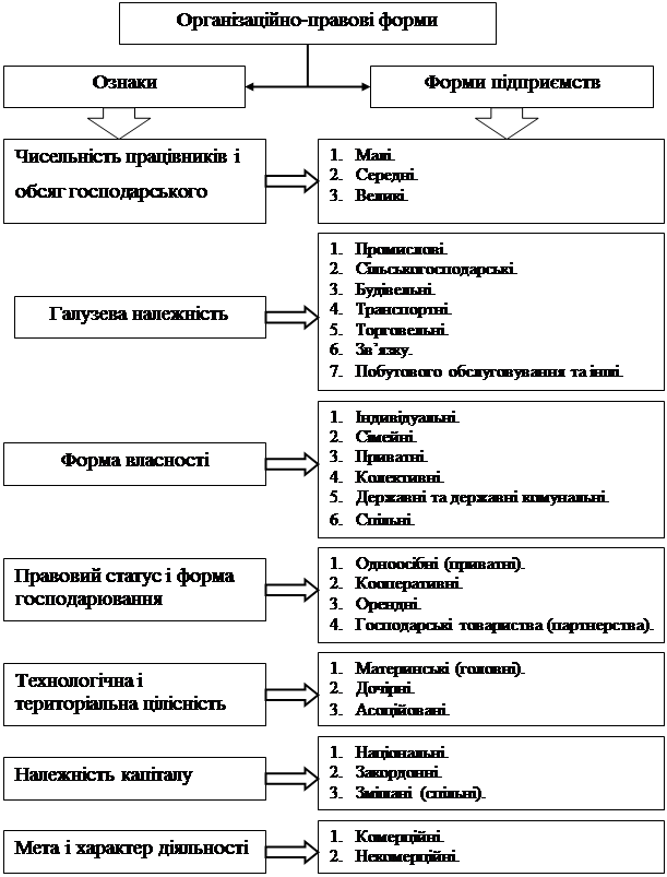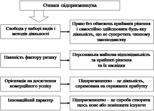 Рис. 1.1. Ознаки підприємницької діяльності.Кожне підприємство відрізняється від інших особливостями продукції, послуг, місцем розташування тощо. Не виключенням є і малі підприємства, які мають свої характерні ознаки. Однак можна виділяти певні основні ознаки, за якими доцільно класифікувати всі організаційно-правові форми підприємств (рис. 1.2).