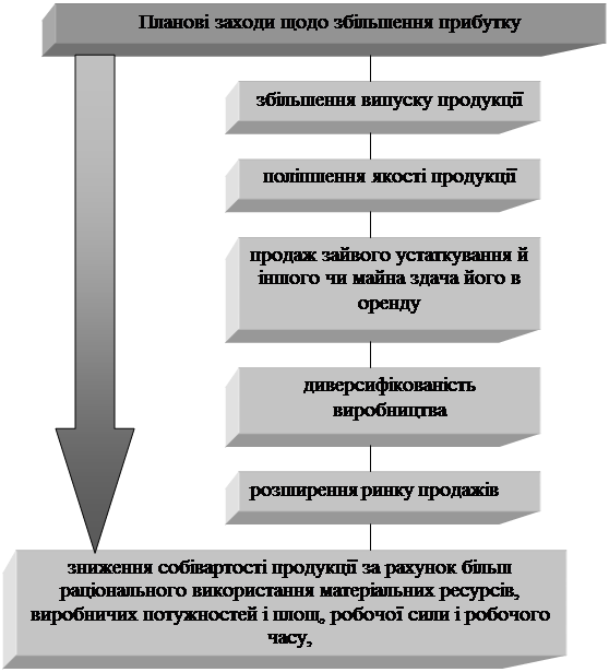 Рис. 1.5. Заходи щодо збільшення прибутку підприємства. З цього переліку заходів випливає, що вони тісно зв'язані з іншими заходами на підприємстві, спрямованими на зниження витрат виробництва, поліпшення якості продукції і використання факторів виробництва. Розглянемо основні способи планування прибутку від реалізації товарної продукції. Головні з них – метод прямого рахунку та аналітичний. Метод прямого розрахунку. Прибуток від реалізації товарної продукції визначається виходячи з виторгу від реалізації цієї продукції (без податку на додаткову вартість і акцизів) і витрат на виробництво і реалізацію, що включаються в собівартість продукції. Перевищення виторгу від реалізації над повною плановою собівартістю реалізованої продукції являє собою прибуток від реалізації товарної продукції. Цей прибуток може бути визначен і методом поасортиментного розрахунку [8]. Розрахунок відбувається за формулою: П = (В·Ц) – ( В·С), (1.9) де П - плановий прибуток; В - випуск товарної продукції в планованому періоді в натуральному вираженні; Ц - ціна за одиницю продукції (за винятком ПДВ і акцизів); С - повна собівартість одиниці продукції. Розрахунку прибутку передує визначенню випуску порівнянної і непорівнянної товарної продукції в планованому році по повній собівартості та в цінах, а також залишків готової продукції на складі і товарів, відвантажених на початок і кінець планованого року. Аналітичний метод. Прибуток від реалізації товарної продукції може бути обчислено на планований період виходячи із базової рентабельності, що склалася на попередній рік. Такий метод розрахунку називається аналітичним (перевірочним). При цьому методі отриманий прибуток від реалізації товарної продукції за минулий рік збільшується в планованому році відповідно до росту реалізації. Плановий балансовий прибуток підприємства розраховується по наступним видах: 1. прибуток від реалізації виробів, робіт і послуг промислового характеру (прибуток від реалізації товарної продукції); 2. прибуток від реалізації робіт і послуг непромислового характеру (прибуток від іншої реалізації); 3. прибуток від планованих позареалізаційних операцій. В умовах ринкових відносин підприємство повинно прагнути, якщо не до одержання максимального прибутку, то, принаймні, до того обсягу прибутку, що дозволяв би йому не тільки міцно утримувати свої позиції на ринку збуту своїх товарів і надання послуг, але і забезпечувати динамічний розвиток його виробництва в умовах конкуренції. В остаточному підсумку це припускає знання джерел формування прибутку і покращення методів їх використання. Кінцевим фінансовим результатом господарської діяльності підприємства є балансовий прибуток. Балансовий прибуток – це сума прибутків (збитків) підприємства, як від реалізації продукції, так і доходів (збитків), не пов'язаних з її виробництвом і реалізацією. Під реалізацією продукції розуміється не тільки продаж зроблених товарів, що мають натурально-речовинну форму, але і виконання робіт, надання послуг [12]. Отже, при аналізі практичної діяльності підприємств різних форм власності важливе значення має розуміння теоретичної сутності і значення господарської діяльності, що значно спрощує прийняття оптимальних управлінських рішень, дає можливість у повній мірі використовувати ресурсний п