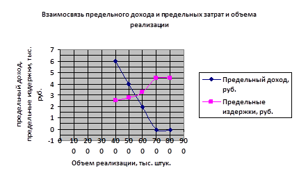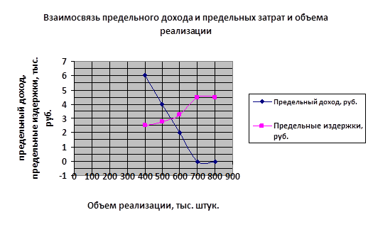 Оптимальная цена достигается в той точке, когда предельный доход равен предельным издержкам, то есть предельная прибыль равна нулю. Предприятие максимизирует прибыль в случаях когда предельный доход равен предельным издержкам. В случае если предельные издержки превышают предельный доход предприятие минимизирует убытки. В случае если цена на за единицу меньше средних переменных издержек то предприятие прекращает производство. На основе данных таблицы 3 строим график взаимосвязи предельного дохода, предельных издержек и объема производства. Таблица 3. Взаимосвязь предельного дохода, предельных издержек и объема производства