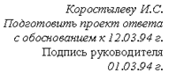 Указания по использованию полученного письма фиксируются в форме РЕЗОЛЮЦИИ, включающей фамилию и инициалы исполнителя, содержащие поручения и срок исполнения. Резолюция обязательно датируется и подписывается. (рис.2) Рис.2