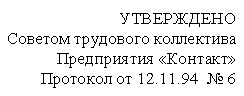 Процессы принятия управленческих решений им сами решения документируются с помощью ПРОТОКОЛОВ производственных совещаний у руководства организации. Документирование хода производственных совещаний и оформление протокола возлагается на сотрудника, ответственного за ведение работы с документами. Протокол - документ, фиксирующий ход обсуждения и принятия решений на собраниях, совещаниях и заседаниях коллегиальных органов. Протокол содержит следующие реквизиты: наименование организации, наименование вида документа, дата заседания, индекс, место заседания, граф утверждения (если протокол подлежит утверждению), заголовок к тексту, текст, подписи. Дата протокола - это дата совещания. Заголовок - это название протоколируемого мероприятия (совещание, заседание, собрание) и наименование коллегиального органа. Текст протокола состоит из двух частей, вводной и основной; · Вводная часть содержит постоянную информацию (слова "ПРЕДСЕДАТЕЛЬ", "СЕКРЕТАРЬ", "ПРИСУТСТВОВАЛИ"), переменную (инициалы и фамилии председателя, секретаря и присутствующих). При необходимости указываются должности присутствующих, а также инициалы, фамилии и должности лиц, приглашенных на совещание. При большом количестве участников совещания составляется список присутствующих, который прилагается к протоколу. · Основная часть текста строится в соответствии с вопросами повестки дня. Построение записи обсуждения каждого вопроса. Повестки дня, осуществляется по схеме "СЛУШАЛИ", "ВЫСТУПИЛИ", "ПОСТАНОВИЛИ" (РЕШИЛИ). Эти слова печатают прописными буквами. Перед словом "СЛУШАЛИ" ставят номер вопроса Повестки дня, после - двоеточие. Инициалы , фамилию докладчика (наименование должности указывается в Повестке дня) печатают в именительном падеже от 1-го положения табулятора; после фамилии ставят тире и с прописной буквы пишут содержание доклада в форме прямой речи. Если текст доклада (выступления) застенографирован представлен докладчиком, то после тире также с прописной буквы пишут - "доклад прилагается". Слово "ВЫСТУПИЛИ" печатают прописными буквами, после чего ставят двоеточие. Инициалы и фамилию выступающего пишут в именительном падеже, от 1-го положения табулятора; после чего ставят тире и с прописной буквы печатают содержание выступления в форме косвенной речи. В случае необходимости после фамилии выступающего указывается наименование должности. В практике применяется краткая и сокращенная форма протоколов, когда не требуется подробная запись хода обсуждения вопросов. В протоколе краткой формы указываются только список присутствующих, рассматриваемые вопросы и принятые решения. В сокращенных протоколах после списка присутствующих или приглашенных указывается порядковый номер вопроса по повестке дня и печатается заголовок к докладу. Последняя строка заголовка доклада (пункт повестки дня) подчеркивается, и под чертой печатают фамилии докладчиков и выступающих в порядке их выступления. Название каждого доклада заканчивается протокольным решением или постановлением. В протоколе может быть пункт об утверждении какого либо документа. В этом случае утвержденный документ прилагается к протоколу и имеет ссылку на его номер и дату (рис.4) Рис.4