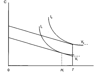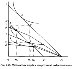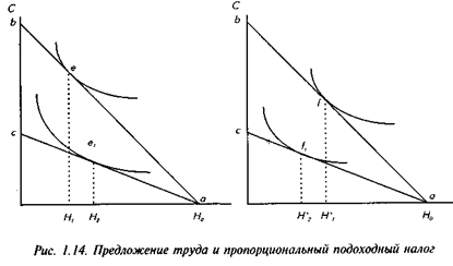 Рис. 1.13 Сравнение воздействия на предложение труда прогрессивного и пропорционального подоходного налогов показано на рис. 1.15. Первоначальные бюджетные ограничения (до введения налога) показаны линией ab . Бюджетные ограничения при введении пропорционального подоходного налога показывает линия ас . Точка f определяет количество часов работы H 1 при введении пропорционального подоходного налога и данных индивидуальных предпочтениях по отношению к работе и досугу. До введения пропорционального подоходного налога, работая H 1 часов, индивидуум получал общий доход 0Y 1 , после введения налога 0Y 2 (Y 1 - Y 2 ) поступает а) Сокращение часов работы при б) Увеличение часов работы увеличении налога при увеличении налога государству в виде налога.