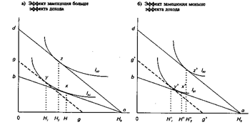 Рис. 1.5 - Чистый эффект дохода при увеличении нетрудового дохода При повышении ставки заработной платы обычно действуют оба эффекта. Увеличение совокупных доходов вызывает действие эффекта дохода и ведет к сокращению количества часов работы, повышение ставки заработной платы вызывает действие эффекта замещения и ведет к увеличению количества часов работы. Эффекты действуют разнонаправлено, и их совокупное воздействие на предложение труда будет зависеть от абсолютной величины каждого из эффектов. На рис. 1.6 изображено различное воздействие увеличения ставки заработной платы с 0b /0а до 0d /0a на предложение труда индивидуумов А и В . На рис. 1.6а доминирует эффект замещения, поэтому совокупное воздействие обоих эффектов приводит к увеличению часов работы, на рис. 1.6б доминирует эффект дохода, поэтому в итоге количество часов работы сокращается. Чтобы выявить чистый эффект замещения, необходимо устранить действие эффекта дохода, т. е. установить, сколько часов предпочел бы работать индивидуум при новой цене досуга (ставке заработной платы), но при старом уровне полезности. Для этого изображается условная линия бюджетных ограничений, параллельная новому ограничению ad и касательная к старой кривой безразличия; (gg является касательной к I А1 , g’g’ - касательной к I В1 для индивидуумов А и В соответственно. При данных ограничениях индивидуумы А и В предпочтут оптимизировать соотношение труд-досуг соответственно в точках у и у’ . При чистом эффекте замещения оба индивидуума увеличат предложение труда: А - с H 0 Н до H 0 Н 1 , В - с H 0 Н ’до H 0 Н 1 ’. Эффект дохода зависит от расположения различных кривых безразличия. На рис. 1.6а и 1.66 эффект дохода отрицателен, т. е. досуг и товары являются нормальными благами, и рост совокупного дохода вследствие изменения ставки заработной платы вызывает увеличение потребления досуга на величину, соответствующую отрезку H 1 Н 2 для индивидуума А и H 1 Н 2 и H ’0 Н ’1 для индивидуума В . Необходимо сравнить относительные величины двух эффектов для каждого индивидуума. Для индивидуума А абсолютная величина отрицательного эффекта дохода H 1 Н 2 меньше величины эффекта замещения H Н 1 . Для индивидуума В величина эффекта замещения H ’Н ’1 меньше абсолютной величины эффекта дохода H ’1 Н ’2 .