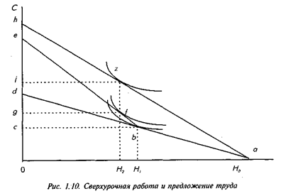 Рис. 1.8 - Выбор работать/не работать при строго определенном количестве часов работы Тогда он перейдет в точку G и будет работать неполное рабочее время H 2 , IB 2 >IB 1 . Работник А также может улучшить свое положение, если ему будет предоставлена возможность выбирать удобное для него количество часов работы, тогда он перейдет в точку К и будет работать неполное рабочее время H 2 , IA 2 >IA 1 . Точка F на рис. 1.86, соответствующая H 1 часам работы и находящаяся на кривой безразличия IB 1 , отражает ситуацию сверх занятости, при которой работник может повысить полезность, увеличивая свой досуг и уменьшая доход. Предельная норма замещения досуга благами в этой точке превышает ставку заработной платы. Точка D на рис. 1.8а, соответствующая нулевому количеству часов работы и находящаяся на кривой безразличия IA 0 , отражает ситуацию недозанятости, при которой работник может повысить полезность, увеличивая свой доход и уменьшая часы досуга. Предельная норма замещения досуга благами в этой точке меньше ставки заработной платы. Сверхзанятость может привести к абсентеизму. Абсентеизм - это ситуация, когда при установленной стандартной продолжительности рабочего времени работник стремится его уменьшить и уклониться от работы. На рис. 1.9 H 1 - это стандартная продолжительность рабочего времени, равновесие достигается в точке с , где кривая безразличия полезности работника I 1 пересекается с линией бюджетных ограничений при стандартной продолжительности работы. За счет абсентеизма может быть достигнут более высокий уровень полезности на кривой безразличия I 2 в точке d , соответствующей H 2 часам работы. Если существует система выплат по болезни и временной нетрудоспособности с полной компенсацией дохода, то работник, прибегая к абсентеизму и неоправданно увеличивая время нетрудоспособности, может обеспечить себе в точке g еще более высокий уровень полезности с кривой безразличия I 3 и с сохранением дохода е . Работодатель может уменьшить абсентеизм, выплачивая премию работникам, отработавшим 100% рабочего времени стандартной продолжительности. Такая премия должна быть равна ей (рис. 1.9), чтобы стимулировать отсутствие прогулов, когда нет компенсации дохода при временной нетрудоспособности, и а в случае, когда существует система полной компенсации дохода, потерянного за время болезни. Возможна ситуация, когда работники работают больше часов в день, чем считается «нормальным» или официально установлено, т. е. работают сверхурочно. В этом случае, как правило, сверхурочные часы работы оплачиваются по более высокой ставке заработной платы. На рис. 1.10 показано, что после «нормального» времени работы H 0 H 1 дополнительные часы работы оплачиваются по более высокой ставке заработной платы. Таким образом, линия бюджетных ограничений преобразуется от abd до а b е . До введения сверхурочной оплаты индивидуум находился в равновесии в точке b на линии бюджетных ограничений ad , работая «нормальное» количество часов.