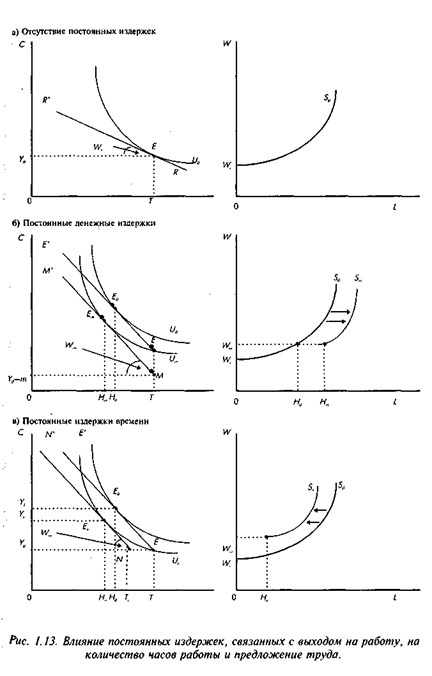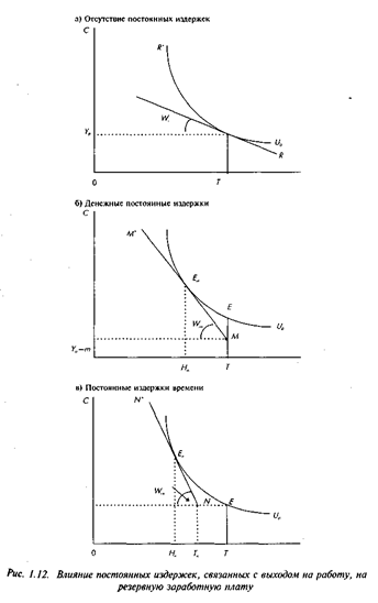 Рис. 1.11 На рис. 1.11 видно, что работники типа В предпочтут сдельную оплату труда повременной, так как первая предоставит им одновременное увеличение дохода YB по сравнению с Y ’B и сокращение часов отработанного времени с H’B до HB . И наоборот, работники типа А предпочтут повременную оплату, так как она даст им более высокий доход Y ’A при меньшем по продолжительности рабочем дне H ’A . Позиция работодателей, стремящихся к максимизации прибыли, будет зеркальным отражением предпочтений работников, т. е. при повременной системе оплаты труда работодателям выгоднее нанимать работников типа В , а при сдельной - типа А . 7. Издержки, связанные с выходом на работуС вступлением на рынок труда могут быть связаны постоянные издержки (денежные или времени), не зависящие от количества часов работы. Эти издержки оказывают влияние на резервную заработную плату и на количество часов работы, максимизирующих полезность индивидуума. При отсутствии постоянных издержек, связанных с вхождением на рынок труда, резервная заработная плата Wr - это наклон кривой безразличия индивидуума при часах работы, равных нулю. На рис. 1.12а этот наклон задан наклоном линии RR ’, которая является касательной к кривой безразличия U 0 в точке Е , где количество часов работы равно нулю. С вступлением на рынок труда могут быть связаны денежные издержки (например, оплата общественного транспорта или покупка специальной одежды) Такие издержки аналогичны вертикальному перемещению линии бюджетных ограничений индивидуума после вступления на рынок труда. На рис. 1.12б это показано отрезком ЕМ . То есть сразу после вступления на рынок труда индивидуум несет постоянные издержки m = ЕМ , которые аналогичны сокращению дохода на величину ЕМ . Точка М расположена чуть левее вертикальной линии ЕТ , чтобы показать, что издержки возникают только, когда индивидуум вступает на рынок труда, т. е. перемещается влево от Т . При существовании таких постоянных денежных издержек резервная заработная плата показана наклоном линии MM ’. Это минимальная заработная плата, любое превышение которой вызовет вступление индивидуума на рынок труда. При данной заработной плате индивидууму безразлично, участвовать ли в рыночной деятельности (точка Em ) или не участвовать (точка Е ). Резервная заработная плата Wrm индивидуума при наличии постоянных денежных издержек выше, чем в их отсутствие (угол наклона линии MM ’ больше, чем угол наклона индивидуальной кривой безразличия в точке Е , который показывает резервную заработную плату в отсутствие постоянных издержек, Wrm >Wr ). Линия ММ ’ является касательной к U 0 в точке Em , которая расположена левее Е на той же кривой безразличия, а в соответствии с предположением об уменьшающейся предельной норме замещения наклон кривой безразличия влево от точки Е круче. Таким образом, постоянные денежные издержки, связанные с вступлением на рынок труда, делают работу на рынке труда менее привлекательной по сравнению с работой в домашнем хозяйстве или досугом. Вступление на рынок труда может также вызывать постоянные издержки времени (например, проезд на работу и обратно). На рис. 1.12в эти издержки показаны количеством часов, вычитаемых из общей продолжительности дня до того, как время будет распределено между работой на рынке труда и досугом (отрезок TTn ). При существовании таких изде