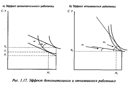 Решением этой модели будет множество оптимальных часов работы для каждого члена семьи: H *i = H *i (w1 /р , w2 /р , . . , Vh /p ). Таким образом, количество часов работы каждого члена семьи зависит от ставки реальной заработной платы других членов семьи, цены потребительских благ и нетрудового дохода семьи. Чем выше заработная плата одного из супругов, тем меньше при прочих равных условиях склонность второго супруга к участию в рабочей силе, поскольку первый имеет сравнительные преимущества на рынке труда. В то же время решение будет зависеть от вида функции полезности. Чем меньшую полезность второй супруг связывает с нерыночной деятельностью, тем более он будет склонен к работе на рынке. Если внутрисемейный перекрестный эффект замещения равен 0 (т. е. предложение труда никого из членов семьи не зависит от заработной платы других членов семьи), то решение модели примет вид: H