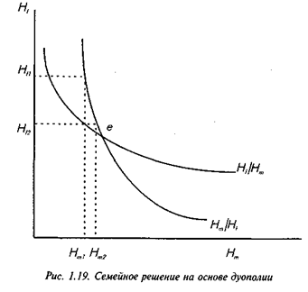 + В данном случае единственный фактор, при помощи которого другие члены семьи влияют на решение о предложении труда i -го члена семьи - это доход семьи, который теперь образуется из Vh и суммы трудовых доходов других членов семьи (g = 1,. . , n ; g ¹1). Модели, предполагающие максимизацию индивидуальных функций полезности при семейных бюджетных ограничениях, подчеркивают роль индивидуума в принятии семейных решений. Эти модели рассматривают максимизацию индивидуальной полезности, когда она является функцией индивидуального досуга и семейного потребления. Один из вариантов таких моделей основывается на модели дуополии. Кривая реакции первого супруга Hm /Hf и кривая реакции второго супруга Hf /Hm показаны на рис. 1.19. Каждая кривая реакции показывает оптимальный (максимизирующий индивидуальную полезность) выбор количества часов работы данным супругом при определенном количестве часов работы другого супруга. Если второй супруг предлагает Hf 1 часов работы, то оптимальным выбором для первого супруга будет Hm 1 часов работы. Однако это решение неустойчиво. В ответ на выбор первым супругом количества часов работы Hm 1 второй супруг будет оптимизировать свое поведение и выберет Hf 2 часов работы. Этот процесс будет продолжаться до тех пор пока решение о выборе часов работы не будет соответствовать точке е на кривых реакции супругов (е - точка пересечения кривых реакции). В данном случае точка е - точка устойчивого равновесия для обоих супругов. Но если наклоны кривых реакции обратны, то точка е не будет точкой устойчивого равновесия. Достаточным условием существования устойчивого равновесия является то, что потребительские блага - нормальные блага для обоих супругов.