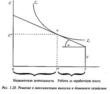 Рис. 1.19 12. Теория распределения времениПростая модель предложения труда (труд-досуг) предполагает, что индивидуум извлекает полезность либо из товаров, купленных на рынке на денежный доход от работы, либо из свободного времени - времени досуга. Однако нерабочее время, или досуг, представляет собой набор различных видов деятельности, часть из которых может рассматриваться как работа в домашнем хозяйстве. Функция производства в домашнем хозяйстве лежит в основе моделей распределения времени, она определяет, каким образом произведенные на рынке блага С , купленные на доход от работы на рынке, сочетаются с временем D , проводимым дома, для производства благ Z . Таким образом, функция производства в домашнем хозяйстве может быть записана так: Z = Z (D , C ), где D и С - несовершенные заменители в процессе производства. В данном случае D - не часы работы, Н - не часы досуга L из простой модели предложения труда. Производство в домашнем хозяйстве осуществляется в условиях ограничений: 0 £D £Т , где Т - все возможное располагаемое время, и С £wH + V , где w - рыночная заработная плата; H - часы работы; V - нетрудовой доход. Часы работы на рынке и в домашнем хозяйстве в сумме дают все возможное располагаемое время: Н = Т -D . В простейшей модели производства в домашнем хозяйстве предполагается, что индивидуум максимизирует выпуск благ. Тогда можно записать функцию Лагранжа: MaxJ^ = Z(T, Q +K(wH+ V - С), где Я = Т- D. ^ = ^-ъ, = о. 3D 3D ^ = 5Z-X = 0 ^ = w(T - D) + V - С = 0. д\ Отсюда решение о максимизации выпуска в домашнем хозяйстве определяется условием: z