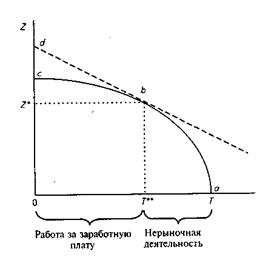 Это решение представлено на рис. 1.20. Наклон изокванты Z может быть определен как теневая заработная плата нерыночной деятельности. Таким образом, домохозяйство максимизирует производство благ в точке, где норма замещения товаров временем равна рыночной заработной плате. Видно, что слева от е z > w и домохозяйству выгоднее заниматься нерыночной деятельностью, и наоборот, справа от е z < w домохозяйству выгоднее заниматься рыночной деятельностью. Хотя показано только внутреннее решение, возможно и угловое решение. Граница производственных возможностей домохозяйства может быть представлена линией abd на рис. 1.21. Наклон кривой abc представляет предельную производительность домашней работы, а наклон линии bd означает предельную отдачу от работы на рынке (т. е. заработную плату). Представим, что домохозяйство находится в точке Т и принимает решение, как распределить первую единицу времени. Поскольку отдача от производства в домашнем хозяйстве превышает рыночную отдачу, предпочтение отдается работе дома. Это справедливо для всех последующих часов, пока не достигается точка Т = Т **, где отдача от рыночной деятельности превышает отдачу от дальнейшей работы дома. Поскольку заработная плата предполагается постоянной, это справедливо для всех последующих часов. Таким образом, линия abd образует границу производственных возможностей домохозяйства.