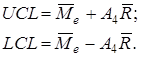 Было решено использовать для управления качеством продукции карту медиан. Значения медиан и размахов также даны в табл. 7. Вычисляем среднее медиан подгрупп и размахов следующим образом:
