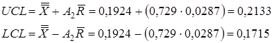 Установленные исходные данные приводят к неоднозначности плана контроля (получилось четыре возможных варианта). Поскольку отношение L0/L1 > 50, то выбираем план с минимальным , т. е. третью строку в табл. 2. Таким образом, Определяем контрольные границы для карты: – границы регулирования: