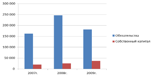 Приведенные в таблице 7 данные показывают, что по сумме обязательства банка увеличились на 11,1% и уменьшились на 26,6% к уровням 2007 и 2008 годов соответственно. Собственный капитал банка увеличился на 80,3% и 43,9% к уровням 2007 и 2008 годов соответственно. На рисунке 5 графически изображена динамика ресурсов АО "Евразийский банк" за 2007-2009 годы. Из графика наглядно видно увеличение ресурсов банка.