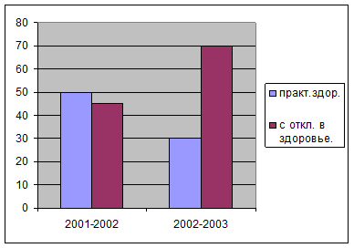 В таблице № 1 приведены данные за два учебных года. Информация характеризует состояние здоровье учащихся в аспекте наиболее распространенных заболеваний. В таблице отсутствуют данные об острых респираторных заболеваниях учащихся в течении учебного года. Данные свидетельствуют о снижении количества учащихся с заболеваниями желудочно-кишечного тракта, ЛОРзаболеваний, гематологических заболеваний. На прежнем уровне осталось количество детей с заболеваниям сердечно-сосудистой системы, органов зрения, почек. В то же время в два раза выросло количество учащихся с ортопедическими заболеваниями. Таблица № 1