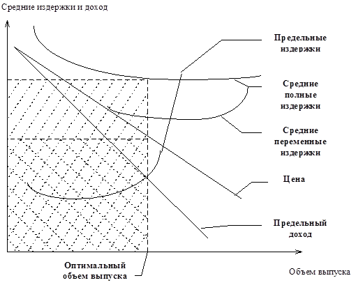 В данном случае равенство предельного дохода и предельных издержек достигается в той точке, в которой цена реализации данного количества продукции выше средних полных издержек. Следовательно, в данном случае предприятие максимизирует свою экономическую прибыль. По данному графику легко определить, какова величина экономической прибыли. На графике заштрихованы полные издержки фирмы на производство продукции ( II случай.