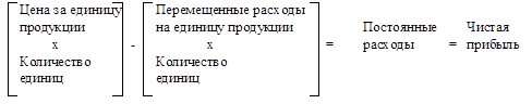 Это же уравнение можно переписать в алгебраической записи. Обозначим прибыль за исследуемый период через П, через Р - цену продажи единицы произведенной фирмой продукции, х - объем произведенной и проданной продукции за указанный период, а - уровень фиксированных расходов, в - переменные расходы на произведенную (и проданную) продукцию. В таких обозначениях уравнение «прибыли-доходов-расходов» выглядит следующим образом: П = Р*х - (а + в*х)(1) или П = (Р - в)*х - а Последняя форма уравнения подчеркивает, что все факторы делятся на зависящие от объема реализации и независящие от него. В частности, как уже говорилось, все расходы фирмы можно разделить на постоянные и переменные. Заметим, что при определении параметров мы разделили издержки на производство реализованной и произведенной продукции. Данное различие является наиболее существенным для двух подходов в управленческом учете: Absorptioncosting и Directcosting. По методу Absorptioncosting калькулирование себестоимости продукции осуществляется с распределением всех затрат между реализованной продукцией и остатками товаров, то есть постоянные расходы являются запасоемкими. При методе Directcosting постоянные расходы полностью относятся на реализацию. Использование уравнения (1) позволяет легко определить точку безубыточности путем несложных алгебраических преобразований. Объем выпуска, при котором достигается точка безубыточности, определяется из условия: П = 0, и он равен хо = (П + а) / (Р - в) = а / (Р - в)(2) В качестве примера рассмотрим расчет точки безубыточности для фирмы ExperimentalElectronicsInc. Для расчета нам понадобятся следующие данные: Цена одного электронного блока, выпускаемого фирмой5000$ Переменные издержки (заработная плата рабочим, стоимость комплектующих и т.д.) в расчете на одно изделие4000$ Постоянные издержки20000$ Максимальный объем выпуска продукции, при котором достигается безубыточность деятельности фирмы: хо = 20000$ / (5000$ - 4000$) = 20 (изделий). Период, за который должно быть произведено ( и реализовано) хо изделий, определяется тем, за какой срок мы определили величину постоянных издержек. Используя уравнение (2) мы также можем определить какого объема выпуска необходимо достичь, чтобы получить определенную величину прибыли. Так, длятогочтобыфирма Experimental Electronics Inc. Получила прибыль в размере 10000$, необходимо произвести: х = (10000$ + 20000$) / (5000$ - 4000$) = 30 (изделий). II. Маржинальный доход. Метод маржинального дохода есть модификация предыдущего. Под маржинальным (предельным) доходом мы будем понимать доход, который получает фирма от производства одного изделия. В нашем примере маржинальный доход равен: 5000$ - 4000$ = 1000$ на единицу. Тогда формула (2) может быть переписана в виде: