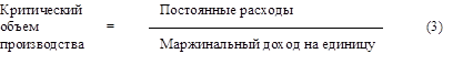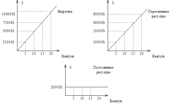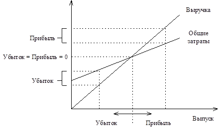 Заметим, что на этом графике линия выручки и линия переменных расходов исходят из одной точки и разница между ними и есть не что иное, как маржинальный доход. Используя данный график мы можем легко определить величину прибыли или убытка для того или иного объема выпуска.