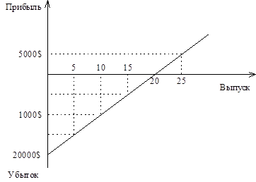 Таким образом, в точке безубыточности финансовый отчет может быть представлен в следующем виде (используя термины маржинального дохода): Всего, $На единицу, $ Выручка 5000$ * 20 единиц1000005000 Переменные расходы 4000$ * 20 единиц800004000 Маржинальный доход200001000 Постоянные расходы200001000 Чистая прибыль00 III. Графический метод. Два рассмотренных ранее метода по своей сути есть методы статические. В самом деле, мы рассматриваем фиксированные цену реализации, переменные расходы, постоянные расходы и прибыль. Далее на основе этих данных мы рассчитываем объем производства, при котором достигается заданная прибыль. Если отказаться от фиксированной величины прибыли, то мы получим зависимость между объемом выпуска и прибылью, которую легко выразить графически. Для этого нам необходимо объединить на одном графике следующие три линии: