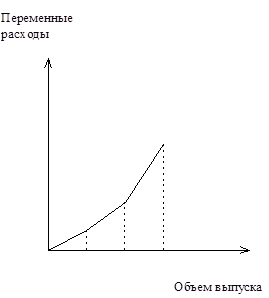 Однако, такое предположение сильно осложняет CVP-анализ, так как график общих расходов становится разрывной функцией. 4. Переменные расходы остаются независимыми от объема выпуска в пределах области релевантности. На самом деле величина переменных расходов есть некоторая функция от объема производства, так как существует эффект падения предельной производительности факторов производства. Поэтому в условиях предположения 3 (независимость постоянных расходов от объема производства) переменные расходы увеличиваются с ростом объема производства. В качестве более точного приближения можно предложить аналогичный ступенчатый график (см. пред. 3):