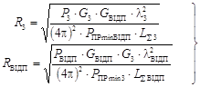 де R3 – дальність дії вторинної радіолокаційної системи за запитом; RВІДП – дальність дії вторинної радіолокаційної системи за відповіддю; P3 – імпульсна потужність запитувача; РВІДП – імпульсна потужність відповідача; G3 – коефіцієнт підсилення антени запитувача; GВІДП – коефіцієнт підсилення антени відповідача; PПРmin3 – чутливість приймача запитувача; PПРminВІДП – чутливість приймача відповідача; SАВІДП – ефективна площа антени відповідача; SА3 – ефективна площа антени запитувача; L∑ 3 – сумарні втрати потужності за запитом; L∑ ВІДП – сумарні втрати потужності за відповіддю. З огляду на те, що