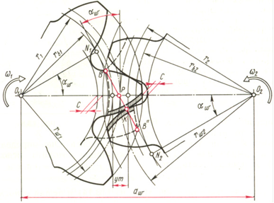 Линия N1 N2 является общей нормалью к эвольвентам и общей касательной к основным окружностям. Таким образом, линию N1 N2 можно рассматривать как геометрическое место точек касания сопряженных профилей. В процессе зацепления, т.е. смены точек контакта прямая N1 N2 не меняет своего положения. Этим доказывается первое существенное свойство эвольвентного зацепления. Эвольвентное зацепление обеспечивает постоянство передаточного отношения в процессе зацепления, т.е.: