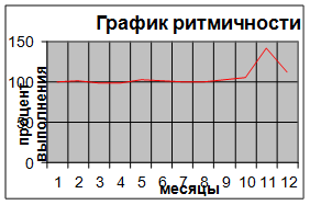 Вывод : так как коэффициент вариации показывает отклонение от среднего уровня выполнения плана в процентном выражении, то его уменьшение свидетельствует о том, что предприятие стало работать более ритмично. 5) график ритмичности выполнения плана (% из таблицы) розничного товарооборота по месяцам: