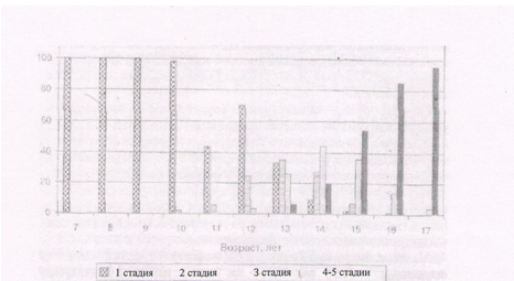 Рис. 2. Распределение стадий половой зрелости у мальчиков 7-17лет III стадия также соответствует 1-й фазепубертата (у девочек до 13 лет, у мальчиков до 15 лет). Она характеризуется активацией половых желез. В крови растет концентрация половых гормонов. У мальчиков увеличиваются размеры яичек и длина полового члена, усиливается оволосение лобка. У девочек усиливается развитие молочных желез и оволосение лобка, начинается оволосение подмышечных впадин. На этой стадии особенно повышается у мальчиков содержание в крови соматотропина и наблюдается пубертатный скачок роста (около 14 лет). Усиленное выделение соматотропина происходит ночью («человек растет во сне») и замедляется в дневное время. IV стадия отмечается во 2-й фазе пубертата (у девочек в 13-14 лет, у мальчиков в 15-16 лет). Она характеризуется максимальным уровнем активности половых желез. Их секреция достигает максимальных значений в 14-15 лет. У мальчиков происходит утолщение полового члена, усиленное оволосение лобка, появление волос на лице и в подмышечной впадине. К характерным признакам этой стадии относят также появление у них на лице юношеских угрей и связанную с удлинением голосовых связок ломку голоса — смену высоких обертонов на более низкие. У девочек заметного развития достигают молочные железы, оволосение лобка приближается к взрослому типу. Увеличиваются запасы подкожного жира. В 12-13 лет появляются первые менструации (так называемые менархе), которые свидетельствуют о начале созревания в яичниках яйцеклеток и становлении периодических процессов женского организма - овариально-менструального цикла (ОМЦ). У мальчиков в 15 лет появляются первые поллюции - выход созревших сперматозоидов из семенных пузырьков вместе с выделениями предстательной железы. Они происходят 1-3 раза в месяц или реже, с перерывами в 10 - 60 дней. Гормон роста - соматотропин сохраняется на повышенном уровне у мальчиков, которые продолжают вытягиваться в длину, но у девочек его содержание снижается и их рост замедляется. В мышцах подростка усиленно формируются быстрые и мощные гликолитические волокна, достигая 50% объема мышцы. Это обусловливает высокий прирост силы. Однако повышенные физические нагрузки в этот период угнетают выделение соматотропного гормона и замедляют процессы, полового созревания. Они должны тщательно дозироваться, особенно у девочек. V стадия завершает 2-ю фазу пубертата (у девонек к 15-летнему возрасту, у мальчиков - к 17-летнему возрасту). Эта стадия определяется достижением зрелого уровня первичных и вторичных половых признаков. Она характеризуется созреванием в мужском организме функционально зрелых сперматозоидов и готовностью женского организма к детородной функции. У девушек происходит созревание в яичниках яйцеклеток и стабилизируется ОМЦ. Выраженность стадий созревания подростков описывается в баллах полового развития (БПР). Для этого оценивается выраженность вторичных половых признаков, определяется сумма их показателей и сравнивается с табличными нормативами, Значительная перестройка деятельности всей эндокринной системы в переходный период отражается на изменениях во всех органах и системах организма, особенно выраженных. В 1-ю фазу пубертата (на II и III стадиях полового созревания). В этот период повышенная активность подкорковых структур и снижение рег