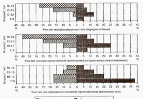 Возрастные перестройки центральной нервной системы управления обеспечивают более экономичное и эффективное выполнение работы. Уточняются моторные команды к работающим мышцам и совершенствуются межмышечные координации Усилившиеся переднелобных третичных полей на двигательную деятельность обеспечивает повышение произвольной мобилизации функциональных резервов организма, волевое преодоление утомления и, соответственно, увеличивает длительность работы до отказа. Возможности участия третичных полей в регуляции движений еще недостаточно развиты у подростков по сравнению с юношами, особенно слабо они выражены в период полового созревания (в 1-ю фазу пубертата). В этот период наблюдается нарушение центральной регуляции движений. Корковые центры широко охватывают процесс возбуждения, нарушая тонкие межцентральные взаимоотношения и координацию движений. Перед стартом у подростков преобладает состояние предстартовой лихорадки. Ухудшаются процессы памяти и выработки двигательных навыков. Затрудняется переделка двигательных динамических стереотипов. Подростки быстро утомляются, особенно при длительной моторной работе. Рисунок 4.Возрастная динамика участия разных зон левого и правого полушария в управлении движениями (модиф. по: Сологуб Е.Б., Капустин В.С., 1986)