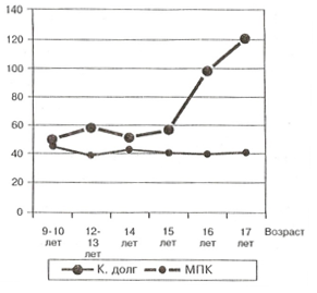 Относительные величины МПК (мл/мин.кг) на протяжении среднего старшего школьного возраста (10-17 лет) практически не изменяются. Это связано с тем, что годовые приросты аэробных возможностей не превышают приростов массы тела. Однако у юных спортсменов, имеющих лучше развитые скелетные мышцы, формирующие аэробное энергообеспечение, относительные величины МПК выше, чем у сверстников, не занимающихся спортом. Относительные величины МПК в женском организме ниже, чем в мужском. У девочек старше 8-летнего возраста относительные величины МПК в среднем школьном возрасте ниже, чем у мальчиков на 12-21%, в старшем школьном возрасте – на 33-39%. Объясняется это тем, что в составе тела у них больше доля жирового компонента, потребляющего незначительное количество энергии. Стабильные величины относительного МПК очень важны в плане отбора. Так как они не изменяются в процессе тренировки и уже в 9-10-летнем возрасте соответствуют взрослым показателям, то их следует использовать как информативные прогностические критерии для отбора детей в ДЮСШ, особенно в иды спорта, требующие развития выносливости. После 14-летнего возраста начинается реализация нового этапа генетической программы онтогенеза. Происходит формирование быстрых мотонейронов в ЦНС и развитие быстрых и мощных гликолитических мышечных волокон в скелетных мышцах. К IV-Vстадиям полового созревания (15-18 лет) быстрые волокна уже занимают по объему около 50% мышечной массы. Устанавливается характерный для каждого индивида состав (композиция) мышечных волокон. С появлением гликолитических волокон происходит быстрое развитие анаэробных возможностей растущего организма. Сократительная деятельность этих волокон не зависит от работы кислородтранспортной системы (крови, сердечно-сосудистой и дыхательной систем), так как они получают энергию в бескислородных условиях. В результате повышается адаптация юношей и девушек к работе анаэробного характера – к выполнению циклической работы в зоне максимальной и субмаксимальной мощности, силовых и скоростно-силовых упражнений. Рисунок 7.Возрастная динамика анаэробных возможностей (кислородный долг, мл/кг) и относительная величина МПК (мл/мин/кг) у мальчиков 9-17 лет