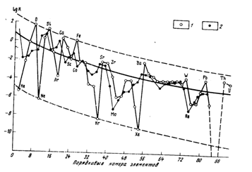 Рис. 1. Логарифмы кларков химических элементов: 1-четных; 2-нечетных. На графике хорошо видны избыточные и недостаточные, или дефицитные, хим. элементы, дающие соответственно пики вверх и вниз. · Из двух соседних элементов периодической системы кларк четного элемента. как правило, выше кларка нечетного. При этом наиболее высокими кларками обладают элементы, раз), разности порядковых номеров которых равны или кратны 6, например О (8), Si (14). · Главными элементами – строителями литосферы являются всего восемь химических элементов – О, Si,Al,Fe,Ca,Na,K,Mg. (см. таблицу 2). При этом ведущее место среди них принадлежит кислороду, составляющему почти половину массы литосферы и около 92% ее объема. Наиболее распространенными являются элементы с наиболее устойчивыми ядрами атомов. Дефицитность же ряды элементов, наоборот, обусловлена малой устойчивостью ядер их атомов. Также существуют гипотезы, которые связывают закономерности распространенности хим. элементов с особенностями образования земной коры как части Земли. Предполагается, что во время возникновения земной коры, существовали такие энергетические условия, которые благоприятствовали образованию хим. элементов с энергией связи в ядре, соответствующей наиболее распространенным хим. элементам. Таким образом, распространенность хим. элементов в земной коре в настоящее время определяется двумя видами закономерностей: обусловленными свойствами ядер хим. элементов и связанными с особенностями образования земной коры как части Земли. Особенности химического состава земной коры достаточно удовлетворительно объясняются механизмом ее образования. Наиболее обоснованной и экспериментально и теоретически является гипотеза о «зонном» выплавлении вещества земной коры из мантии, разработанная А.П. Виноградовым. В основу ее экспериментального обоснования положен технологический процесс зонной плавки. Механизм этого процесса представлен на рис. 2.