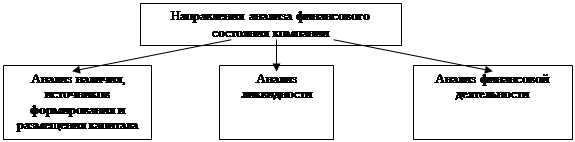 Рис.4. Направления анализа финансового состояния компании У лизинговой компании могут быть три источника финансирования - собственный, привлеченный и заемный капитал. В силу специфики лизинга преобладает заемный капитал (займы организаций и банковские кредиты). (см. табл.5) Таблица 5-Динамика и структура капитала МЛК
