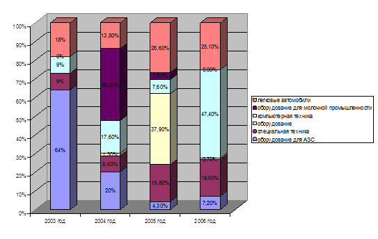 Рис.5. Структура имущества, переданного в лизинг, МЛК за 2003 - 2006 г. г. Таким образом, в первом году своего существования компания преимущественно передавала в лизинг оборудование для АЗС (63,5%), что связано с тем, что основным клиентом в то время было ОАО "Удмуртнефтепродукт", но начиная с 2004 года доля данного вида имущества, передаваемого в лизинг, резко сокращалась - ОАО "Удмуртнефтепродукт" оснастил строящиеся и существующие АЗС в полном объеме, необходимость в оборудовании для АЗС практически отпала. Достаточно стабильно передавалась в лизинг специальная техника (автокраны, грузовые автомобили, бензовозы и т.д.) - ее доля не снижалась ниже 7%. Подобную же тенденцию демонстрирует компьютерная техника. Оборудование для изготовления молочных продуктов активно приобреталось лишь в 2005 г. (от 40% до 50% в общем объеме) - в 2005 г. оно приобреталось исключительно для "Х", В диапазоне от 13% до 27% постоянно приобреталась компьютерная техника. Наличие постоянно меняющейся структуры имущества, приобретаемого для передачи в лизинг, свидетельствует об универсальности лизинговой компании - приобретается шесть различных видов имущества. Структура лизинговых сделок по срокам представлена на рисунке 6.