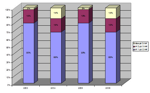 Рис.6. Структура лизинговых сделок МЛК за 2003 - 2006 г. г. по срокам Структура лизинговых сделок по срокам характеризуется следующим образом: стабильно держится на уровне 16-19% доля сделок со сроком от 2 до 3 лет (оборудование, легковые автомобили стоимостью свыше 300 т. р.); сделки со сроком свыше 3 лет (специальная техника, АЗС) занимали значительную долю (47,6%) в 2004 г., резко снизилась их доля в 2005 г. и в следующие годы постепенно возрастала до 28,9%; сделки со сроком от 1 до 2 лет начали заключаться преимущественно с 2005 г. (компьютерная техника, легковые автомобили стоимостью меньше 300 т. р.). Существует несколько схем реализации лизинговых сделок. Условно их можно разбить по способу финансирования на 2 типа: 1 с финансированием сделки за счет средств лизингополучателя; 2 с привлечением дополнительных финансовых ресурсов. Первый тип лизинговой сделки финансируется полностью лизингополучателем, реализуется в частности с помощью применения вексельной схемы и используется исключительно для оптимизации налогообложения лизингополучателя. При втором типе лизинговой сделки структура финансирования лизинговой сделки выглядит примерно следующим образом: 20-50% - финансирует лизингополучатель, 80-50% - либо средства лизинговой компании, либо средства банков. Финансирование средств лизингополучателем оформляется в МЛК соглашением о задатке. Данная особенность в первую очередь имеет своей целью дисциплинировать лизингополучателя и обезопасить лизинговую компанию. Главное отличие задатка от аванса, применяемого на практике большинством лизинговых компаний, состоит в том, что в случае расторжения договора лизинга вся сумма задатка остается у "невиновной" стороны. Лизингодатель в любом случае заинтересован в реализации лизинговой сделки, что обусловлено, во-первых, возможностью получения закладываемой маржи в лизинговые платежи, во-вторых, существующими обязательствами, принятыми на себя лизинговой компанией для финансирования сделки перед банками и т.д., либо риском потерять вложенные собственные средства. В дальнейшем, при выставлении лизинговых платежей на протяжение срока лизинга по договоренности составляются соглашения о погашении взаимной задолженности путем взаимозачета, по которым часть задатка зачитывается в погашение обязанности по оплате лизингового платежа. В результате лизингополучатель относит на затраты сумму, указанную в выставленном счете-фактуре, а фактически перечисляет в оплату лизингового платежа сумму за вычетом задатка. Для привлечения кредитов банков для финансирования лизинговой сделки лизинговая компания разрабатывает оптимальную структуру обеспечения, финансирования, собирает необходимые документы. Именно, кредиты банков являются превалирующим способом финансирования лизинговых сделок второго типа, особенно крупных - от 1 млн. руб. В целом за весь период деятельности МЛК структура финансирования лизинговых сделок приведена на рисунке 7.