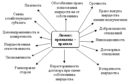 Рис.10. Основные принципы и особенности лизинговых отношений Поскольку лизинг выражает определенное взаимодействие элементов производительных сил и производственных отношений, то он имеет материально-вещественную основу и социально-экономическое содержание. Социально-экономическое содержание лизинга определяется отношениями собственности и совместной экономической деятельности по вертикали и горизонтали (с собственником, обществом и т.д.), а также условиями трансформации собственности. Материально-вещественная сторона лизинга характеризуется организационно-правовыми формами производства, наймом всех или части вещественных элементов предпринимательской деятельности, куплей - продажей имущества и условиями кредитования. Поэтому упрощенное понимание лизинга, сведение его содержания лишь к долгосрочной аренде, имеющей место не только в экономических публикациях, но и в ст.665 ГК РФ, далеко не исчерпывает сущности этого вполне доступного, но еще недостаточно осознанного и оцененного в нашей стране инструмента предпринимательства. Считается общепризнанным, что лизинг тесным образом связан с арендным механизмом, и это действительно так. Но в деловом обороте лизинг имеет более широкую, сложную тройственную экономическую основу и сохраняет в себе одновременно существенные свойства кредитной сделки, инвестиционной и арендной деятельности, которые тесно сочетаются и взаимопроникают друг в друга, образуя в совокупности новую организационно-правовую форму бизнеса. В нем реализуется комплекс имущественных отношений, связанных с передачей средств производства во временное пользование путем их купли и последующей сдачи в аренду. Поэтому определение лизинга с позиции только одного из трех участников сделки не может адекватно выразить его сущность. В то же время каждый из них (инвестор, лизингодатель и арендатор) по своему статусу и преследуемым целям фактически является предпринимателем соответствующей сферы национального хозяйства. Так, инвестирование в общем - это, как известно, долгосрочное вложение капитала в объекты предпринимательской деятельности с целью получения прибыли или социального эффекта. Аналогичны ориентации и лизингополучателя, и лизингодателя. Но лизинг относится к предпринимательской деятельности более высокого уровня по сравнению с арендными, банковскими или коммерческими отношениями, так как он требует глубоких знаний и финансового бизнеса, и положения в производстве, на рынках оборудования и недвижимости, а также изменяющихся потребностей клиентов и особенностей аренды. Следовательно, лизинг - это система предпринимательской деятельности, включающей в себя три вида организационно-экономических отношений: арендные, инвестиционные и торговые, содержание которых в отдельности полностью не исчерпывает сущности специфических имущественно - финансовых лизинговых операций. Лизинг как сложное социально-экономическое явление, выполняет важнейшие функции по формированию многоукладной экономики и активизации производственной деятельности. Из многочисленных функций лизинга согласно поставленной задаче целесообразно выделить финансовую, производственную, снабженческую и обеспечение налоговых льгот. Финансовая функция выражается в освобождении товаропроизводителей от единов