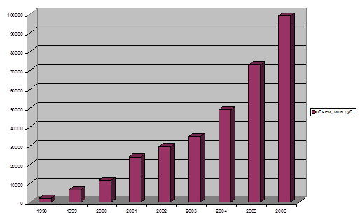 Рис.15. Динамика лизинга в РФ в 1997-2006 гг. Тем не менее, можно говорить о том, что объем лизинговой индустрии России незначителен, а темпы роста очень медленные. На долю РФ приходится всего лишь 0,28% общего объема лизинговых операций пятидесяти ведущих стран мира. У Германии этот показатель равен 4,7%, у Японии - 18%, на США приходится 47%, суммарный объем лизинговых сделок в США равен почти 200 миллиардам долларов. Россия находится в конце третьего десятка из пятидесяти участников в рейтинге стран по развитию лизинга. Самый распространенный предмет лизинга в РФ - сельскохозяйственная техника. Это связано с тем, что на ее приобретение, как правило, выделяется бюджетное финансирование. Далее следует лизинг медицинской техники, автолизинг и лизинг компьютерной техники. Большинство российских лизинговых компаний предлагает грузовой и пассажирский автотранспорт, производственное и телекоммуникационное оборудование. Сейчас все большее количество лизинговых компаний в своей деятельности ориентируется на малые и средние предприятия (порядка 38%; на средние и крупные - 15%; только на крупные - 7%; на предприятия любых размеров - 40%). Лизинг является эффективным механизмом финансирования этого сектора, который банковская сфера традиционно обходила стороной. Самым распространенным источником финансирования российских лизинговых компаний являются кредиты российских банков. Также в первую тройку входят коммерческие кредиты поставщиков и средства российских банков-учредителей. Собственные средства как источник финансирования находятся лишь на девятом месте. Темпы развития лизинга не соответствуют сегодняшним потребностям экономики, и спрос на эти услуги полностью не удовлетворяется. Тем не менее, перспективы рынка лизинговых услуг можно оценить положительно. Скорее всего, вопрос развития лизинга - это всего лишь вопрос времени. Развитие лизинга положительно скажется на состоянии российской экономики. Один из факторов, препятствующих ускорению экономического роста, - это изношенность основных фондов российских предприятий. Процесс их обновления финансируется в основном за счет нераспределенной прибыли предприятий и сдерживается отсутствием доступного заемного капитала. Лизинг как механизм альтернативного финансирования может сыграть важную роль в выполнении этой стратегической задачи, стоящей перед российской экономикой, - в переоснащении основных фондов промышленных предприятий. Существующие препятствия развитию рынка лизинга условно можно разделить на три основные группы: препятствия технического характера - такие как несовершенство отдельных законодательных норм и правоприменительной практики в сфере лизинга и близких областях; препятствия, имеющие системный характер для российской экономики - то есть не только для лизингового бизнеса, но и для всей предпринимательской деятельности в России; и препятствия, обусловленные исключительно “юностью” российского рынка лизинга. Среди “технических” препятствий можно выделить следующие. 1) Остаются недоработанными или не соответствуют практике лизинговой деятельности положения в Законе “О финансовой аренде (лизинге) ” в части вторичного использования в целях предоставления в лизинг изъятого имущества, в части однозначного толкования порядка завершения договора лиз