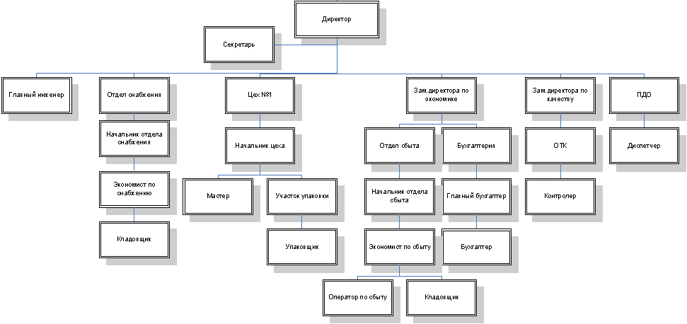 Рис. 3.1 Организационная структура предприятия Порядок анализа организационной структуры на наличие организационных несоответствий подробно описан в Методике «Совершенствование системы управления». После проведения такого анализа необходимо представить руководству Заказчика перечень основных несоответствий с предложениями по их устранению. Как уже отмечалось ранее, все подразделения классифицируются по видам доходов / расходов, которые они несут в процессе своей деятельности, и им присваивается статус соответствующего ЦФО. Центры затрат (ЦЗ) образуют подразделения, которые для выполнения своих функциональных обязанностей потребляют различные ресурсы, что означает для предприятия что подразделение, с экономической точки зрения, воздействует только на затраты. Примером Центров затрат являются различные производственные подразделения и функциональные службы (цех, склад, бухгалтерия, реклама, охрана). Центры затрат определяют расходную часть бюджета предприятия. Центры дохода (ЦД) отвечают за доход, который они приносят фирме за счет своей деятельности и определяют доходную часть бюджета. Центром дохода может выступать подразделение компании, занимающееся реализацией готовой продукции, товаров и услуг, т.е. функционально предназначенное для получения дохода в виде выручки (Отдел продаж, склад-магазин, оптовая база, сеть агентов, фирменных магазинов и т.д.). Центры маржинального дохода (ЦМД) несут ответственность за величину получаемого маржинального дохода. Создаются на предприятиях, где есть подразделения осуществляющие более сложный вид деятельности - не одно производство (как центры затрат), и не одну торговлю (как центры дохода), а, например, производство и реализацию продукции определенной номенклатуры, т.е. фактически являются отдельными бизнес - процессами (бизнесами). Бизнесы отвечают за эффективность деятельности, контролируя доходную и расходную части своего направления. Мерой эффективности бизнеса будут являться не доходы и затраты направления по отдельности, а разница между ними в виде маржинального дохода. Под маржинальным доходом (прибылью) понимается разница между выручкой и прямыми (прямо прослеживаемыми до объекта возникновения) затратами. Полученная таким образом сумма маржинального дохода идет сначала на покрытие накладных затрат направления, потом накладных предприятия и далее на формирование чистой прибыли всего предприятия. То направление, которое приносит наибольший маржинальный доход, является и наиболее выгодным для предприятия. Таким образом, предприятие обеспечивает эффективность деятельности своих отдельных направлений бизнеса, ставя им в ответственность уровень маржинального дохода. Центры прибыли (ЦП) отвечают перед руководством суммой заработанной прибыли, т.е., они по аналогии с центрами маржинального дохода контролируют как расходную, так и доходную сторону своей деятельности. Но центры прибыли рассчитывают доходы и затраты не отдельного направления, а всего предприятия в целом. Соответственно, центром прибыли выступает предприятие, как самостоятельное, так и в составе многоуровневой структуры, например, холдинга. Центры инвестиций (ЦИ) являются верхним уровнем финансовой структуры. Они имеют право управлять не только оборотным капиталом, т.е. отвечать за объем