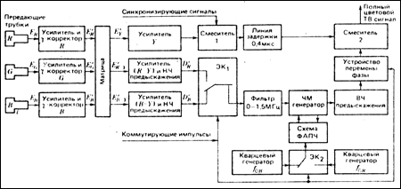 Рис. 2. Функциональная схема формирования сигналов цветности в приемнике. Модулированная цветоразностными сигналами поднесущая складывается с сигналом яркости в схеме сложения. Здесь образуется полный ТВ сигнал, поступающий затем на радиопередатчик.