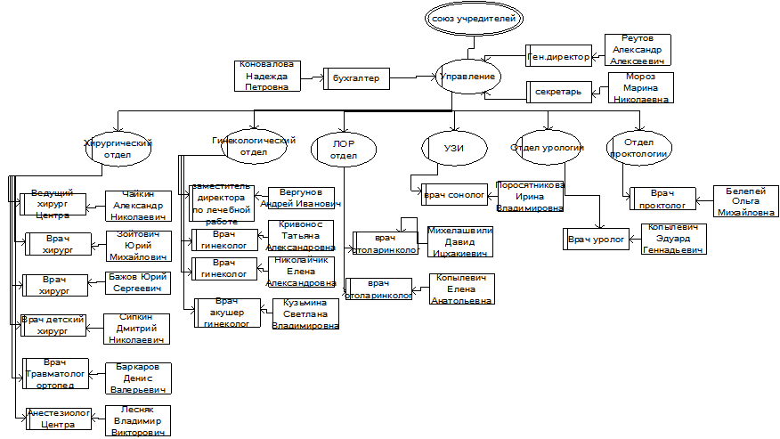 Отдельными видами деятельности, перечень которых определяется федеральным законом, общество может заниматься только на основании специального разрешения (лицензии). Если условиями предоставления специального разрешения (лицензии) на осуществление определенного вида деятельности предусмотрено требование осуществлять такую деятельность как исключительную, общество в течении срока действия специального разрешения (лицензии) вправе осуществлять только виды деятельности, предусмотренные специальным разрешением (лицензией), и сопутствующие виды деятельности. ООО "ЦЭТ" является юридическим лицом по законодательству Российской Федерации, имеет круглую печать, имеет штампы и бланки со своим фирменным наименованием. Общество имеет расчетный счет в учреждении банка. Правовое положение общества определяется законодательством, учредительным договором от 21.07.98г., а также Уставом. Для обеспечения минимального размера имущества, гарантирующего интересы кредиторов общества, за счет вкладов участников общества создан уставный капитал в размере 10 000 рублей. Участниками общества являются три учредителя с равными долями (1/3). Для оказания медицинских услуг используется современное оборудование последнего поколения фирмы "Олимпус" и "Карл ШТОРЦ". Благодаря оборудованию и опыту хирургов высшей категории проводятся уникальные операции в области проктологии, ЖКБ, гинекологии, урологии и др. отмеченные почетными грамотами и благодарственными письмами на уровне Управления Здравоохранения города Красноярска. Оборудование и сверх технологичный инструмент проходит плановый технический осмотр специалистами из сертифицированных центров. ООО "ЦЭТ" работает в тесном контакте с медицинскими центрами и лабораториями края: Лаборатория ИХМИ, Центр СПИД, ГУ НИИ Медицинских проблем Севера СО РАМН. В связи с ограниченностью площадей, оперативное лечение проводится по предварительной записи (плановые). Конкуренция в данной сфере услуг высока, но благодаря рекомендациям пациентов получившим услуги в клинике приходят новые пациенты. Организационная структура ООО "ЦЭТ". Кабинеты следующих врачей: лор - 1, уролог - 1, проктолог - 1, гинеколог - 2, узи - 1. Индивидуальные палаты на 2 человека - 8. Палата интенсивной терапии-1. Операционный блок - 2 зала. ООО "ЦЭТ" арендует помещение на третьем этаже МСЧ общей площадью 771 кв. м. Медицинская санитарная часть (далее МСЧ) предоставляет услуги: пищеблока; лаборатории; аптеки изготовления лекарственных растворов; персонала обслуживающего здание (сантехник, электрик, газосварщик и т.п.). Между ООО "ЦЭТ" и МСЧ заключен договор аренды и договор оказания услуг. Списочная численность ООО "ЦЭТ" 70 человек. Врачей - 17, медицинских сестер - 14, административно-управленческий персонал - 6, младший медицинский персонал - 33 сотрудника. Три основных материально ответственных лица (МОЛ). Имеет следующую организационную модель (рис.2.1). Таблица 2.3 Материально ответственные лица
