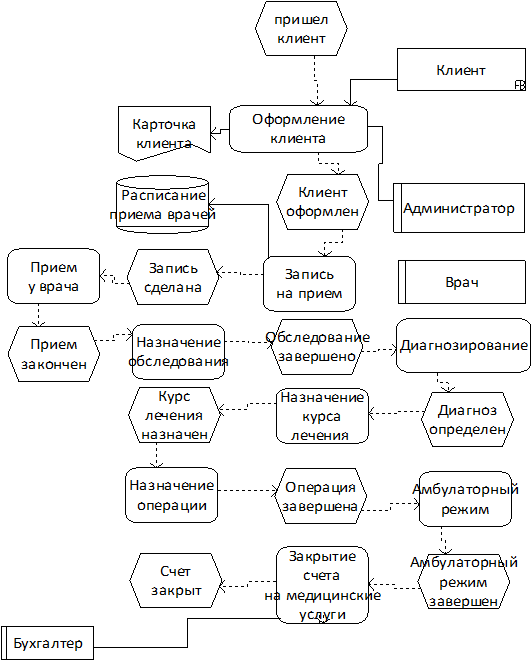 Рис.2.2 Учет медикаментов и инструментов Пункт 1: Постовая мед. сестра ведет книгу учета медикаментов, согласно истории болезни. Делает заявку на медикаменты. Подписью (в книге на посту и на складе) удостоверяется выдача материала. Пункт 2: Медицинская сестра опер блока с вечера берет материалы на следующий день и заявку на будущий период. МОЛ на складе делает пометку о выдаче. Пункт 3: Выдает материалы сильнодействующие и спиртосодержащие анестезиологам. Учет расхода ведется по Ф. И.О. пациента в книге учета. Пункт 4: По мере поступления требований на медикаменты делается заявка на будущий период. Пункт 5: По мере использования шовного материала, выхода из строя инструментов делается заявка на их приобретение. Пункт 6: Доверительные отношения с поставщиками (10 лет), что позволяет производить оплату по факту получения материалов. Пункт 7: Получение документов по поступившим материалам, подпись руководителя на оплату. Пункт 8: Копии с/ф и накладная с материалом передаются на склад. Пункт 9: Подпись МОЛ в получении материала. Сдача книг учета на проверку поступления материалов, инвентаризации, списания. Пункт 10: Старшая медицинская сестра операционного блока устно сообщает о списании инструмента. Пункт 11: Получение инструмента и регистрация его в книге учета инструмента. С сертификатами. 2.5 Медицинская информационная системаНа данном предприятие картотека пациентов, учет медицинских услуг, процедура приема пациентов и запись их к врачам-специалистам, расписание приема врачей все это записывается и хранится в бумажном виде. На сегодняшний день модель работы с информационными источниками представляет вид (рис 2.3). На этой модели ясна необходимость автоматизации рутинных операции, осуществляемые сотрудниками регистратуры поликлиники, чтобы выполнять свою работу более быстро и эффективно; организовать процедуру приема пациентов и запись их к врачам-специалистам, оптимально составить расписание приема врачей, исключая возможность совершения ошибок.