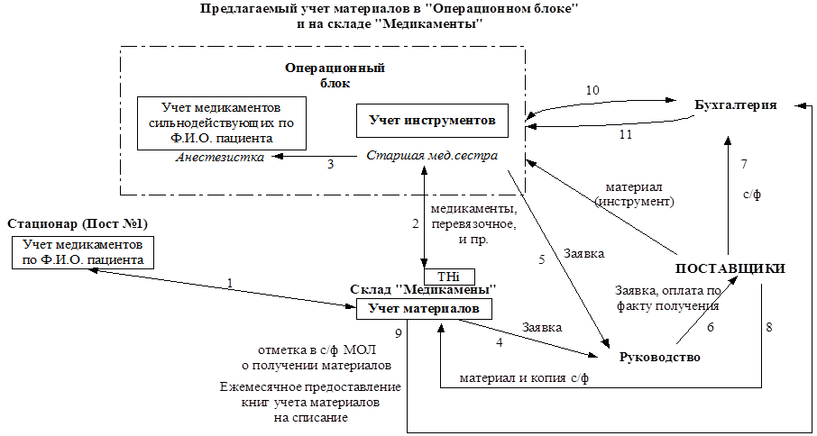 Рис.3.1 Введение контроля на проблемных участках учета материалов На основании введения контроля на проблемных участках учета материалов и при рассмотрении вышеназванных проблем, выявлены пункты, содержащие проблемные моменты: Пункт 2: Медицинская сестра опер блока с вечера берет материалы на следующий день и заявку на будущий период. МОЛ на складе делает пометку о выдаче. Пункт 10: Старшая медицинская сестра операционного блока устно сообщает о списании инструмента. Согласно требованиям и правил в6едения первичных документов, решить эти проблемы можно следующим образом: Пункт 2: Ввести требование накладную по видам ТМЦ, для ежедневных отметок о выдаче. Сдавать ее вместе с книгами учета материалов. Пункт 10: В конец месяца бухгалтерия должна предоставить ведомость поступивших инструментов и шовных материалов, в которых старшая медсестра опер блока сделает отметки на списание и распишется. Пункт 11: На основании документа п.10 бухгалтерия составляет акт на списание, в составе которой должна присутствовать подпись хирурга. Второй вариант списания инструмента в операционном блоке, это ввести обобщающую классификацию по инструментам, которую утвердить приказом директора (рис.3.2). Ежедневно Старшая сестра операционного блока должна отражать выбывающий инструмент (пункт 7). В конце месяца она подписывает документ у ведущего хирурга и передает в бухгалтерию. На основании чего бухгалтерия проводит списание.