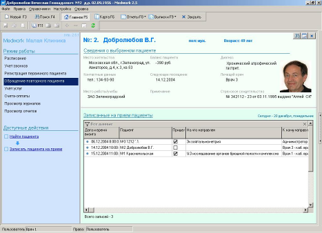 Рис.3.7 Регистратура На рассмотренных примерах информационных систем можем сделать вывод, что их применение на медицинских предприятиях имеют большое количество преимуществ, такие как: Программа следит за правильностью заполнения электронной истории болезни - напоминает, если не указаны некоторые значения (диагноз, дата выписки, исход лечения); Отчеты по обращениям, назначениям и сумме оказанных услуг по видам рекламы Позволяет вести полный учет оказанных пациенту медицинских услуг Подключение неограниченного числа рабочих мест; Автоматизация документооборота Программа имеет минимальные требования к компьютерам (достаточно Pentium-I). Структура хранения данных оптимизирована. Программа постоянно обновляется, с учетом пожеланий пользователей системы Составление и контроль выполнения планов лечения MEDWORK - МАЛАЯ КЛИНИКА Система "Малая клиника" предназначена для небольших клиник и частных кабинетов. "Малая клиника" - современная система автоматизации медицинских учреждений, обеспечивающая ввод, хранение и обработку информации на всех основных этапах лечебного процесса.