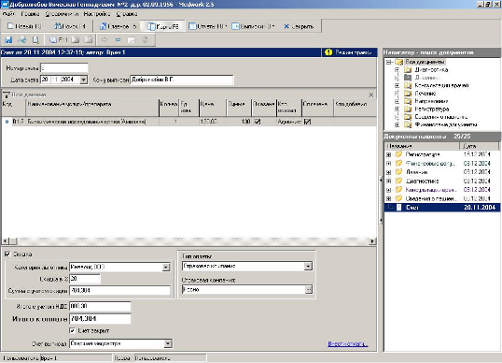 Рис.3.19 Справочник медицинских услуг Программа предоставляет все важнейшие инструменты для контроля над работой клиники и подготовке разнообразной отчетности - о посещениях пациентов и оказанных услугах. Автоматизировано, без каких-либо дополнительных действий Расчеты с клиентами Использование системы в работе клиники помогает облегчить труд главного бухгалтера и экономиста, предоставляя большой объем систематизированных данных об оказанных врачами услугах, оплате лечения пациентами. Оплата лечения проводится администратором-кассиром на основании данных, полученных в результате заполнения врачом амбулаторной карты пациента. Таким образом, отпадает необходимость дублирования записей, администратору просто нужно ввести внесенную пациентом сумму и программа автоматически зарегистрирует платеж в базе данных. С помощью программы администратор может быстро узнать баланс пациента и историю его платежей и посещений. Для всех платежей автоматически формируются сопроводительные финансовые документы: квитанции, счета.